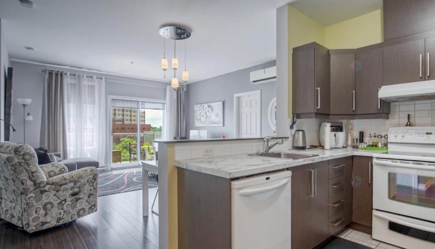 Condo lumineux au dernier étage avec stationnement intérieur, situé dans un emplacement de choix à Longueuil!Situé au 4e et dernier étage d’un immeuble bien entretenu avec ascenseur et terrasse commune sur le toit, ce condo offre un cadre de vie à la fois confortable, fonctionnel et superbement localisé, à proximité de tous les services : commerces à grande surface, hôpital Pierre-Boucher, écoles, CPE, espaces verts et le populaire Parc Michel-Chartrand, poumons de la ville de Longueuil. Ce condo propose une aire de vie ouverte baignée de lumière, avec un salon agrémenté de grandes fenêtres et d’une porte patio menant au balcon privé, un coin repas convivial et une cuisine offrant beaucoup de rangement et un bon espace de travail. On y retrouve deux chambres à coucher fermées dont une chambre principale avec un très grand walk-in ainsi qu’un coin boudoir parfait pour aménager un bureau à domicile ou un coin lecture confortable.La salle de bains complète propose une douche indépendante, un bain ainsi qu’un meuble lavabo avec vaste rangement. Une salle de lavage fermée avec rangement et aspirateur central ajoute à la fonctionnalité de l’espace.Le balcon privé, accessible par le salon, permet d’y créer un agréable coin détente avec vue dégagée sur les environs. Le condo comprend également un stationnement intérieur à louer en sus.Bienvenue à l’unité 406. Un parfait équilibre entre confort, luminosité et localisation stratégique!